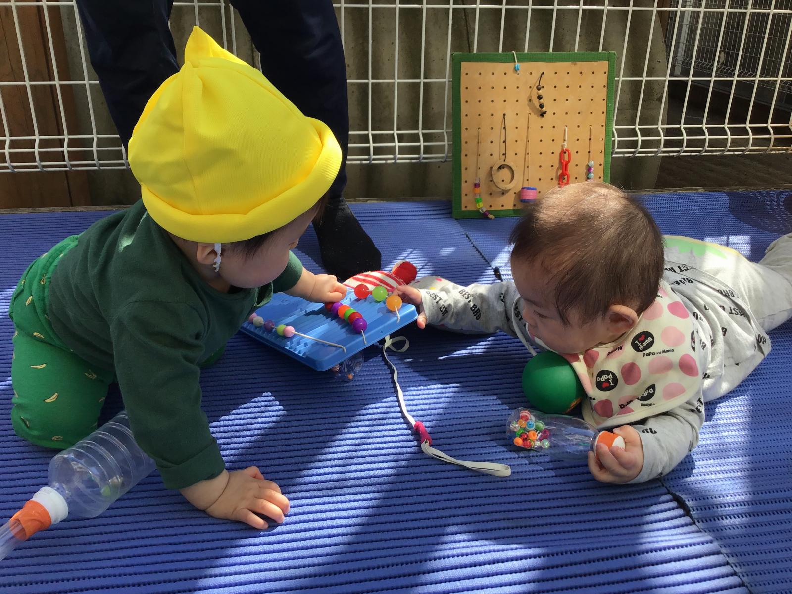 ぴよぴよ組(0歳児)ではお天気の日にデッキスペースにマットを敷いて外気浴を楽しんでいますよ。