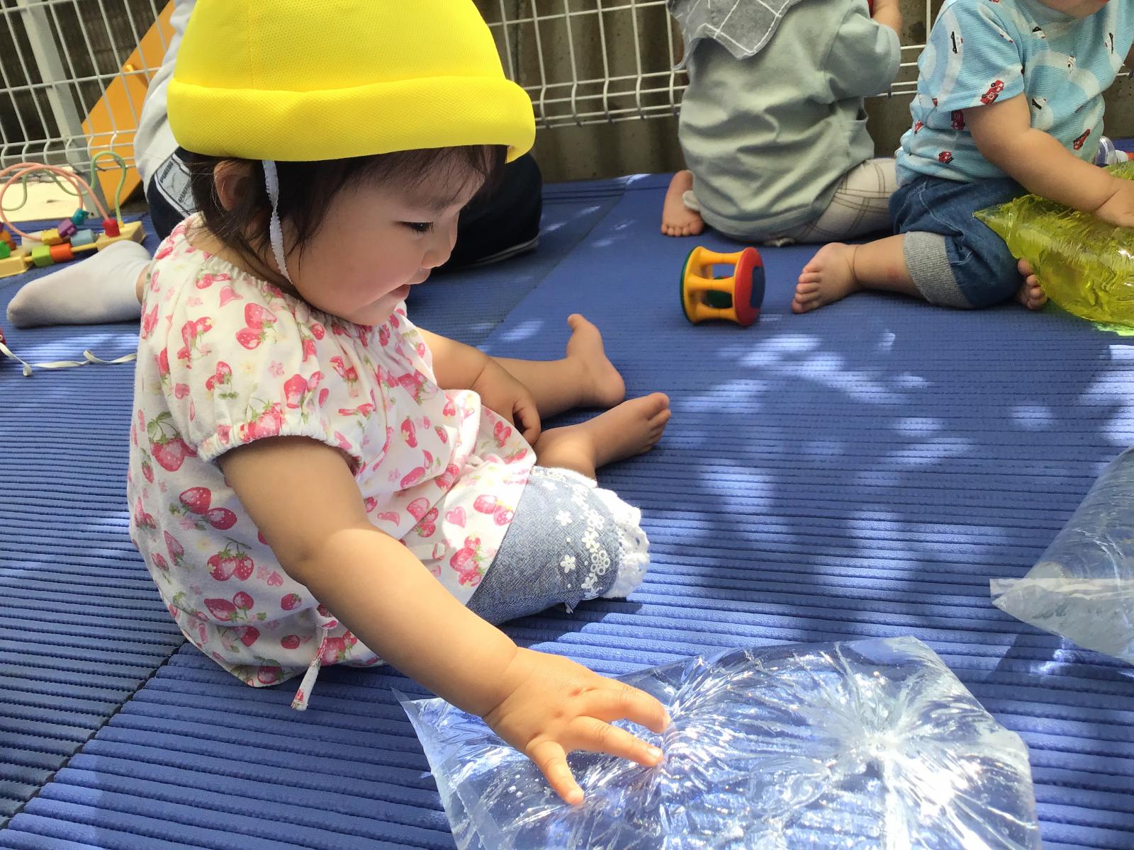 暑い日にはクールダウンということで、ぴよぴよ組は少しずつお水に触って遊んでいます!!
