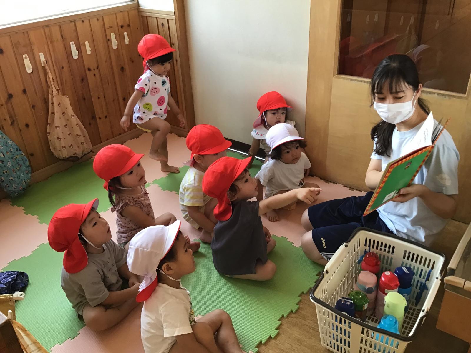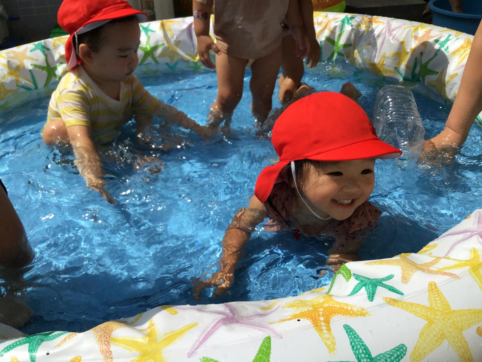 今日からプールあそびが始まりました! まず絵本「メイシーちゃんのプール」を読んで プールのイメージをしてみましたよ。 やる気満々でレッツゴー!! いざ、プールの中に! みんな興味津々で中に入っていきました。 冷たくて気持ちいいね~★ まだ体に水がかかるのが怖い子もいれば 水の中をすいすいと進んだり 先生と水のかけ合いを楽しむ子もいましたよ。 まだまだ暑い日が続くので プールで色々なあそびを楽しみたいと思います!