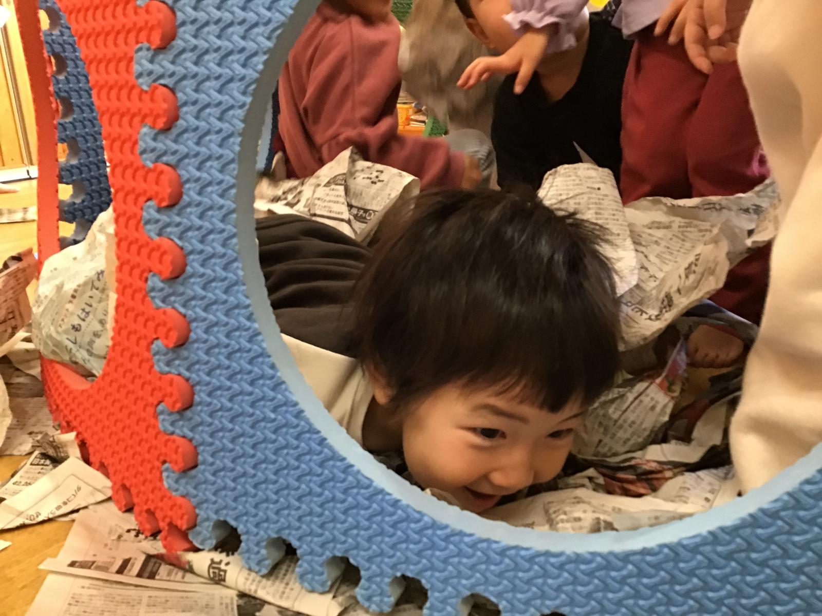 型抜きマットを大きなお風呂に見立て、新聞紙あそびからスタート!