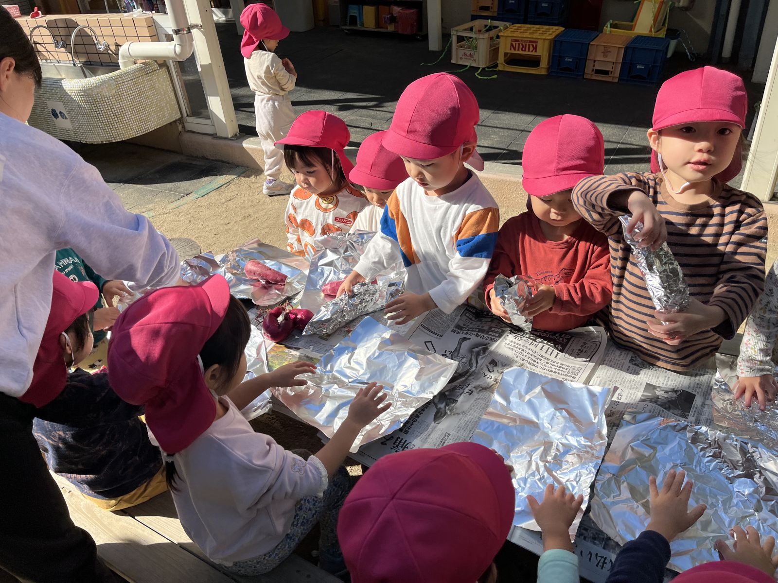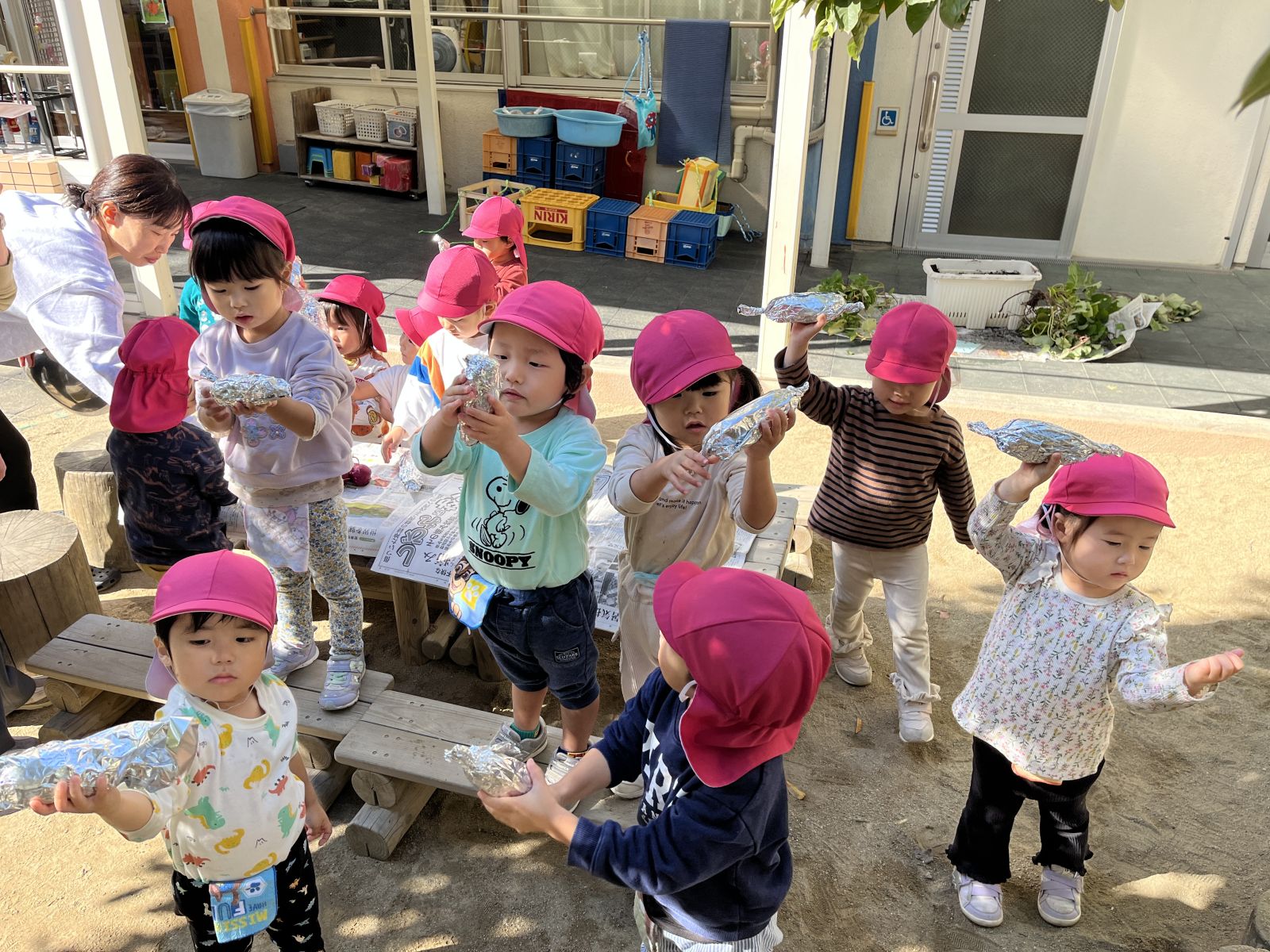 「できたよー!」包んだ芋は調理員さんに焼いてもらいます。