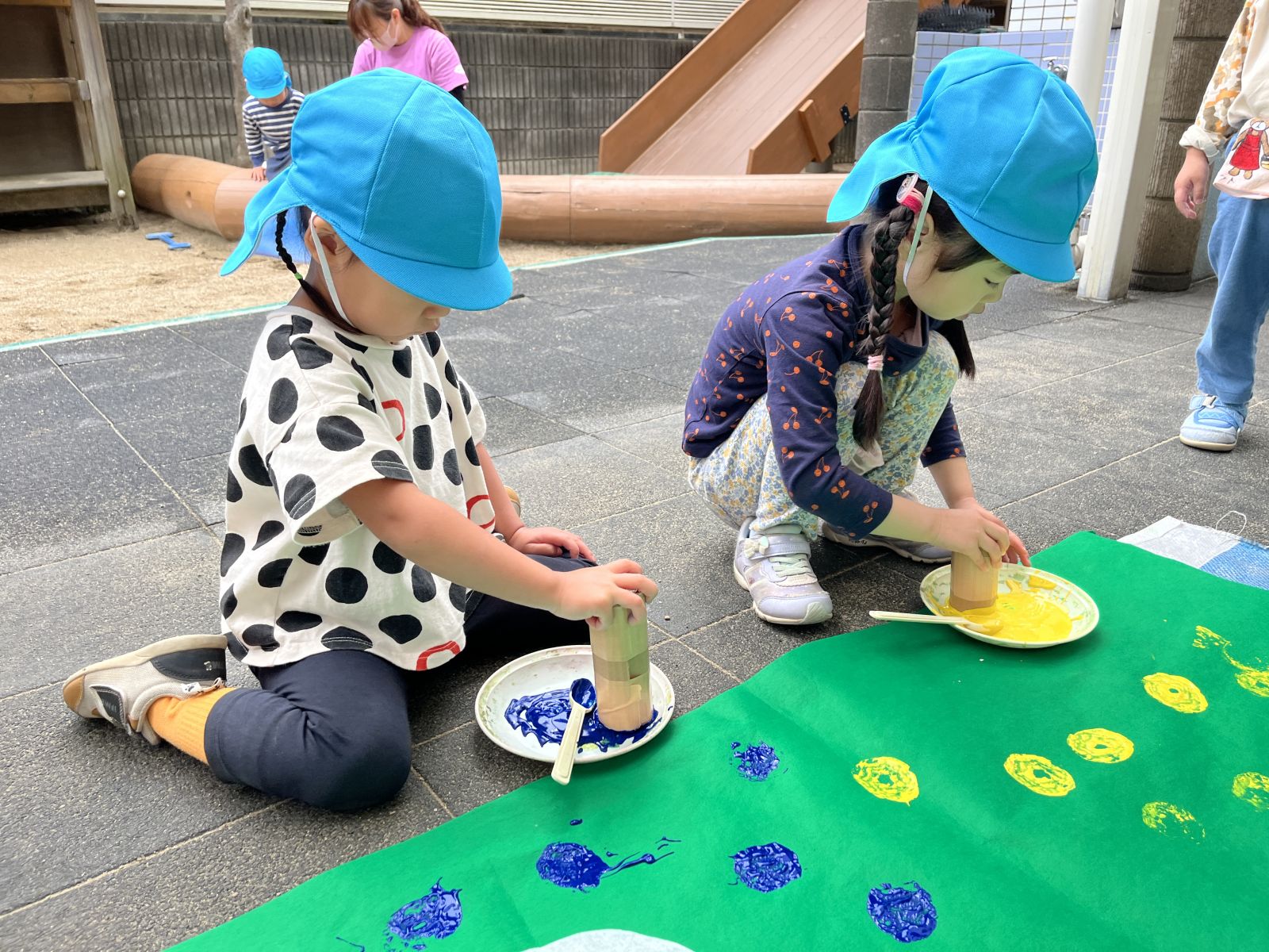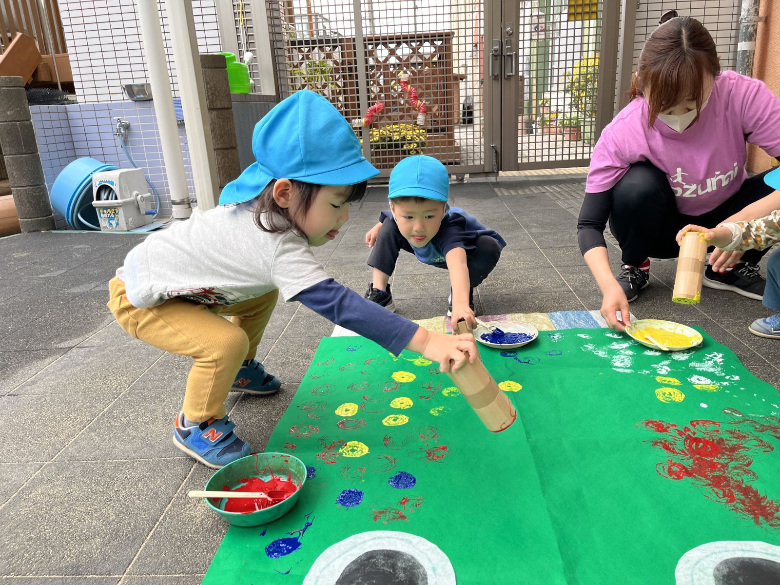 緑のこいのぼり→段ボールスタンプでたくさん模様を付けます。
