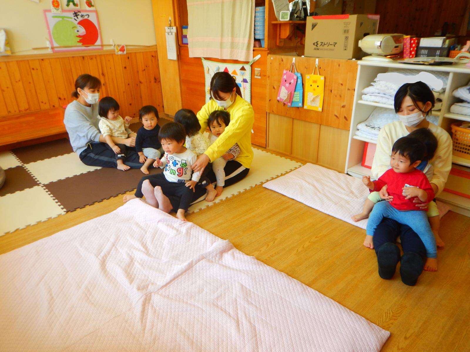 0歳児では保育者と一緒にふれあいながら体操をしています。 『一本橋こちょこちょ』や 『バスにのって』が大人気で「やって~」とすぐに集まってきますよ。 ピアノの音に合わせてお猿さんになったりお馬さんになったりなど 動物の動きをまねっこして体を動かすのを楽しんでいます‼