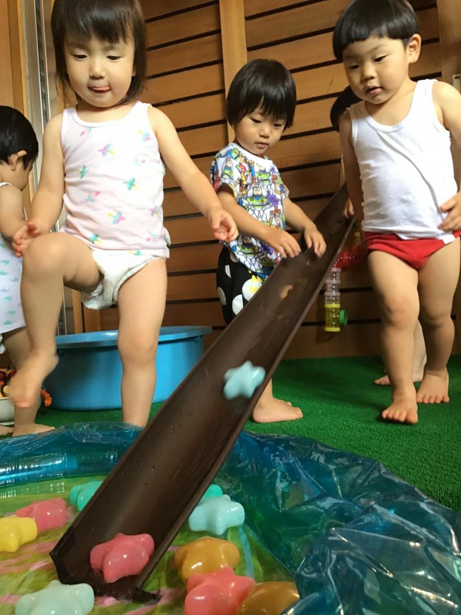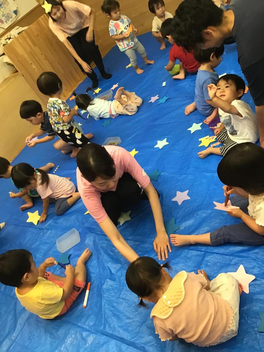 星にシール貼りやお絵描き 星を頭や身体につけて、お友だちとくっついて 天の川をつくったり、流れ星のように速く走ったりして遊びました。 わーいわーい!!織姫様と彦星様が遊びに来てくれました。 鈴を鳴らしながら、一緒にうたいましたよ。 たくさんのお星さまと水遊び!! 星のスライダーに天の川のトンネル お空の織姫様と彦星様は会えたかなぁ。