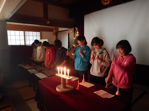 途中に、ハンドベル・鉄琴・木琴で奏でる先生たちからの歌のプレゼント♪