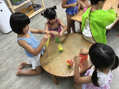 どんな色水になるかワクワクしながら、割りばしで混ぜますよ。