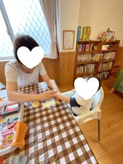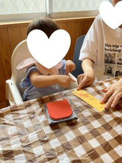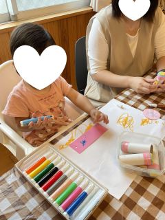 読書の秋、本のおともにしおり制作をしています。 いろんな色で模様をつけたりちょんちょんちょん♪ ハートや星などいろんな形のスタンプをとんとんとん♪ ペンも使ってカラフルに☆ お母さんと一緒にぎゅっ! まあるい部分にはお子さまの写真や好きなものを貼ったりして 世界にひとつだけのしおりが完成です☆