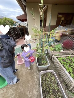 園庭にある菜園の葉っぱをみて、にんじんの葉っぱやオクラなど興味津々!