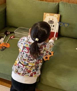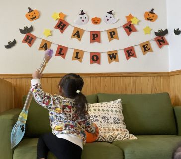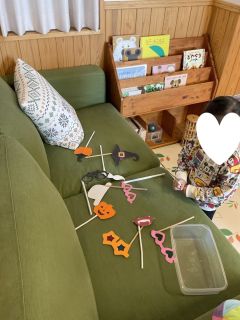 どのメガネにしようかな♪帽子は何にしようかな♪ これはどうかな? くまさんは青いハートのめがねね♡ こちらにはかわいい魔女さん♪ほうきもってどこにおでかけかな? こんなところにオバケ発見!! とんがり帽子にマントを羽織った魔法使いも!! フォトスポットで仮装して大好きな家族とハイチーズ♡ 今日もたくさんかわいいお友達に会えました♡ ハッピーハロウィン★