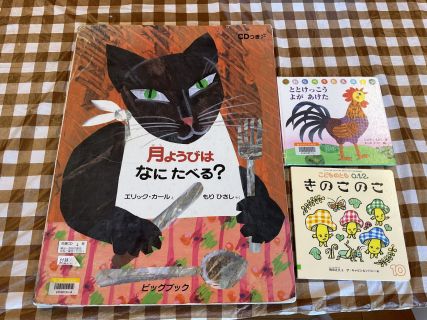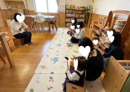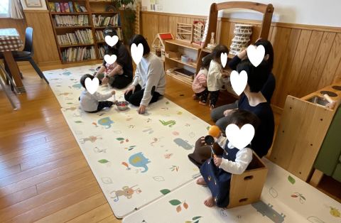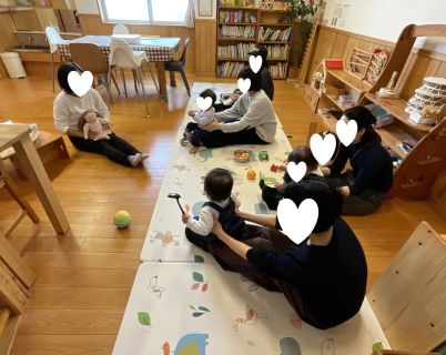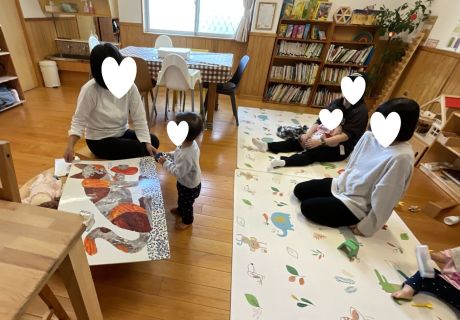 おはよ~♡今日はどのおもちゃにしようかな♪ おはなし会までおうちの人とまったりタイム♡ 「て~をたた~こ~う♪」いつもの手あそびでおはなし会スタート♪ ふれあい遊び「ママのすべりだい」 お母さんのすべり台はやさしくてたのしーい♡ おおきな絵本は迫力満点!! 今月のおはなし会の絵本です♪